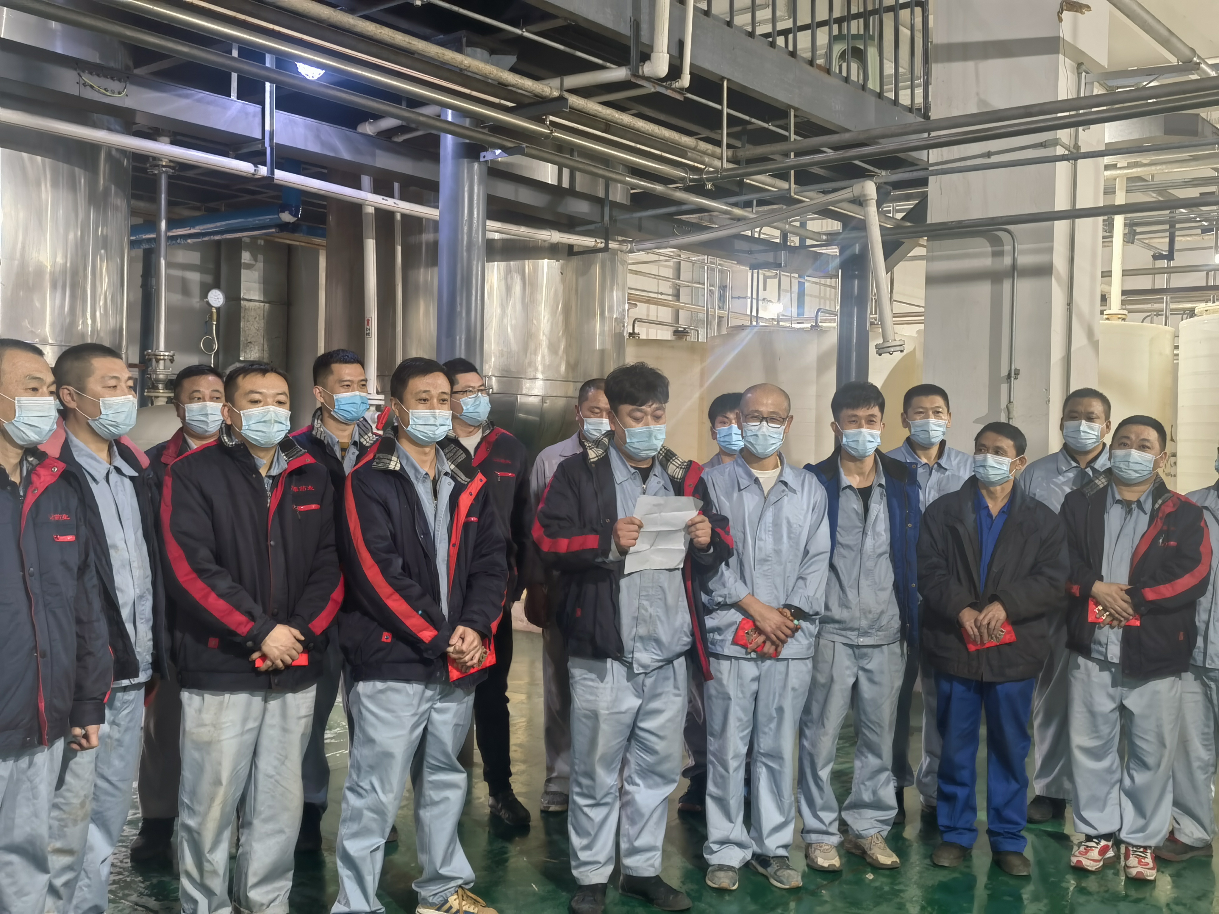 作為保供企業(yè),為了滿足市場(chǎng)藥品需要,公司重點(diǎn)供應(yīng)藥品的生產(chǎn)不能停。經(jīng)過向上級(jí)疫情防控指揮中心申請(qǐng)獲批準(zhǔn)后,公司研究決定,原料生產(chǎn)總監(jiān)劉剛組織下,在鑫泰基副總經(jīng)理劉新華、原料車間副主任馬尚、于洋帶領(lǐng)下,原料車間的32名一線員工他們甚至都沒有時(shí)間來得及安頓好家人,毫不猶豫的從29日起,就開始日夜堅(jiān)守在工作崗位上。由于人員有限,生產(chǎn)任務(wù)艱巨,他們每個(gè)人的工作量超出平常工作強(qiáng)度,有些員工常常深夜還忙碌在生產(chǎn)崗位上,有時(shí)天還沒亮,就又開始了新一天的工作。白天他們加緊生產(chǎn),晚上睡在潔凈區(qū)、操作間、休息室、辦公室臨時(shí)準(zhǔn)備鋪蓋上窄小的折疊床上。由于緊張的工作頻率,又不能夠很好的休息,很多員工感冒了,但他們沒有一個(gè)人退縮,沒有一句怨言,吃著感冒藥、消炎藥崗位上堅(jiān)守了余天,保質(zhì)保量完成了生產(chǎn)任務(wù)。